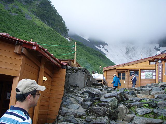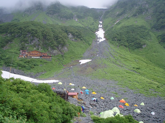 AM8:00 涸沢ヒュッテに着いてしばし休憩です。9:00になっても、悪天候の中、険しい南尾根を北穂高に向けて登る人影は見えません。