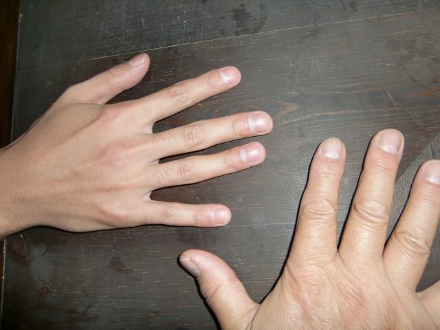 左がピアニストのエリピーの手、右はお父さんWoodyさんの手です。ピアノを弾く指は肉厚で鍛えられています。