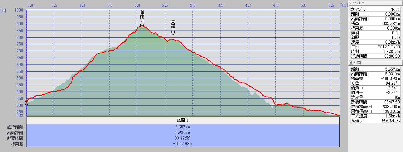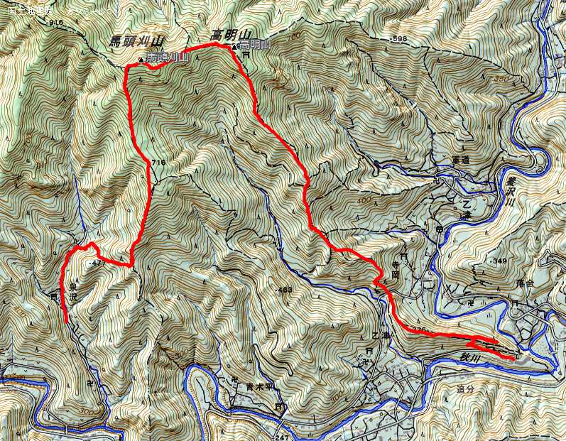 「武蔵五日市」駅(ホリデー快速あきがわ1号)[7:48] ⇒数馬行きバス[9:00]⇒ 和田向[9:18] ⇒ 馬頭刈尾根登山口[9:48] ⇒ 泉沢尾根[10:05] ⇒馬頭刈山[11:08] ⇒ 昼食⇒ 出発[11:40] ⇒高明山[12:00]⇒ 瀬音の湯[13:20]