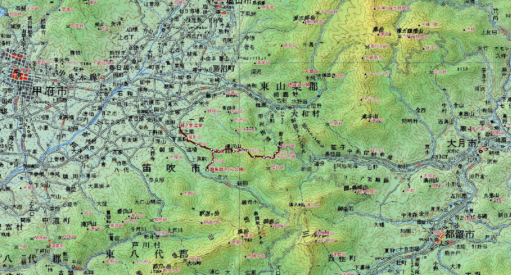 | 2013年4月13日(土)のプラン 京戸山〜達沢山〜旭山から桃の里へ下りるコース きついところはありませんが、甲府盆地に向かってなだらかな尾根をずっと降りてくる、 全行程実働6時間くらいかかるコースです。早出で行きましょう。桃の里温泉で立ち寄り入浴できます。 勝沼観光タクシーに問い合わせたら、すべてのゲートが開くのは4月25日以降。でも、笹子隧道(笹子雁ヶ腹摺山の登り口のあるトンネルのところ)まではタクシーで上がれるそうです。 ほぼ、この松浦本の通りに行けます。 さくら公園から籠袋(達沢山の西)に上り、桃の里へ下りるコースも考えましたが、 登高差460m、踏破距離5kmではちょっと物足りないかな〜と思いました。 |