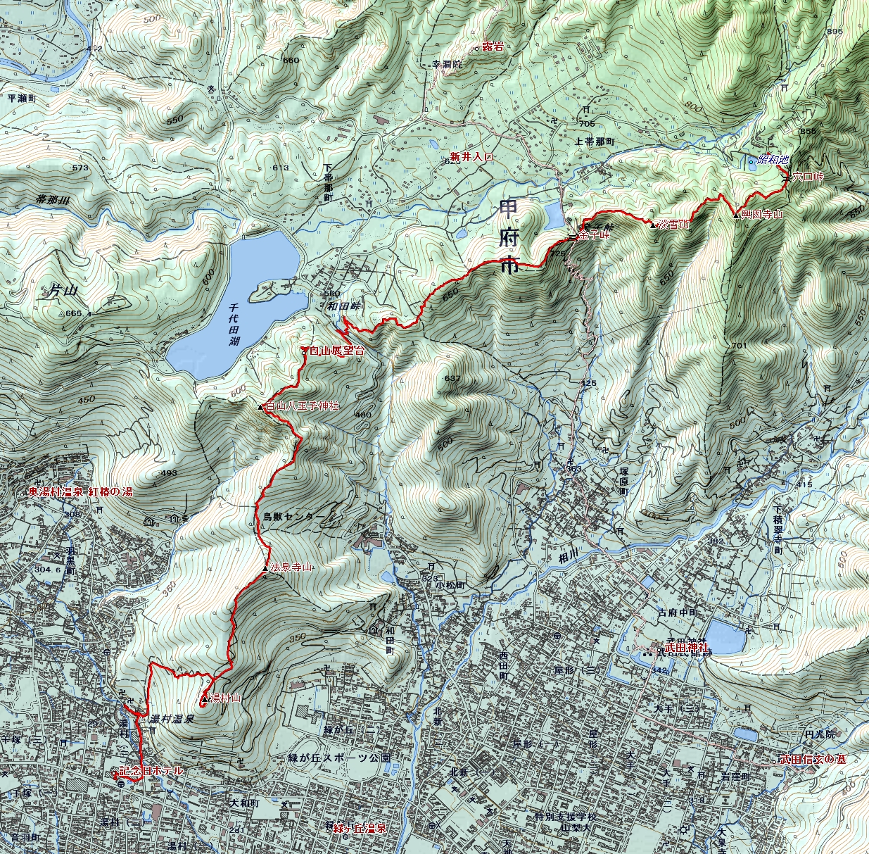 昭和池~興因寺山~淡雪山~白山~湯村山~記念日ホテル