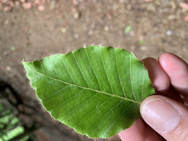 | ブナの葉。平行な葉脈と、ふちのフレアーが特徴です。 | ブナの葉は、きちっと折った折り紙のよう。谷折りの場所に葉脈が走っています。若い葉には毛も残っているんですね。 |