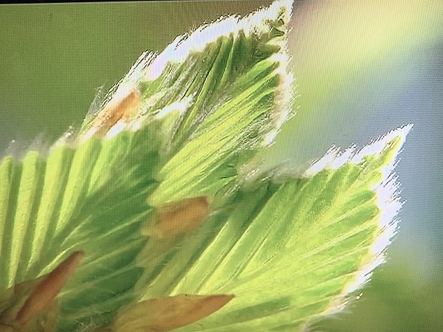 | TVからキャプチャした、ブナの葉の芽吹き。 導管がそのまま毛のように繋がっているのでしょうか。 だからブナは、水をたくさん蓄えられるのかな。 | ミズナラの葉。 よくジブリのグッズで、トトロと一緒に描かれる葉です。 |