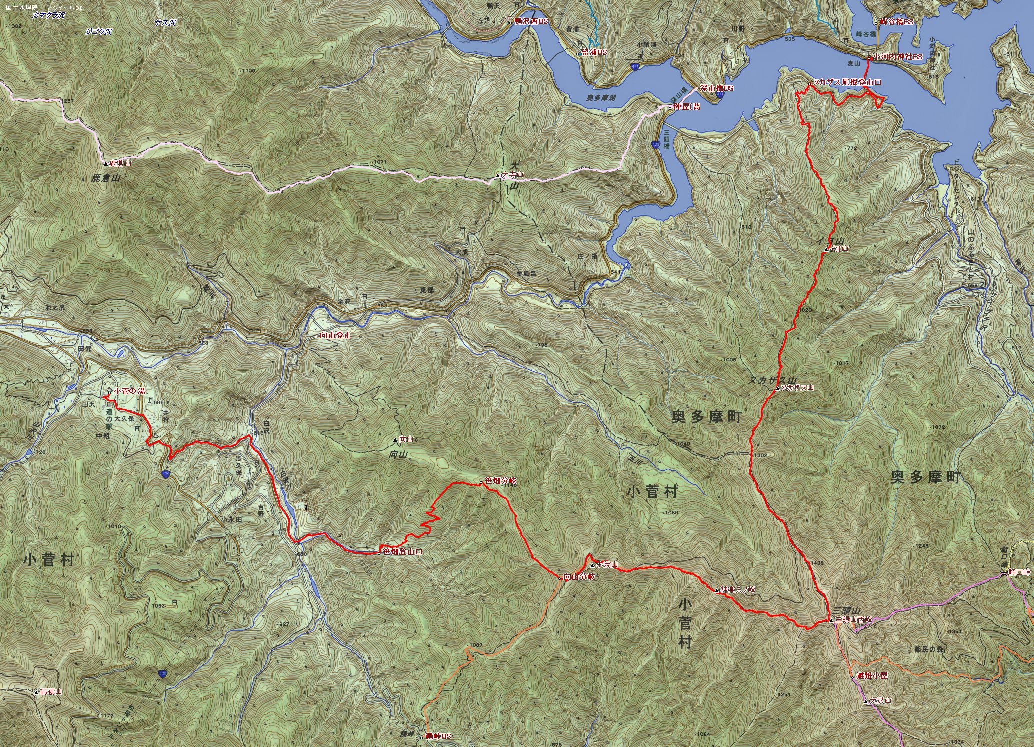 小河内神社BS~イヨ山~ヌカザス山~三頭山西峰~神楽入ノ峰~笹畑登山口~小菅の湯