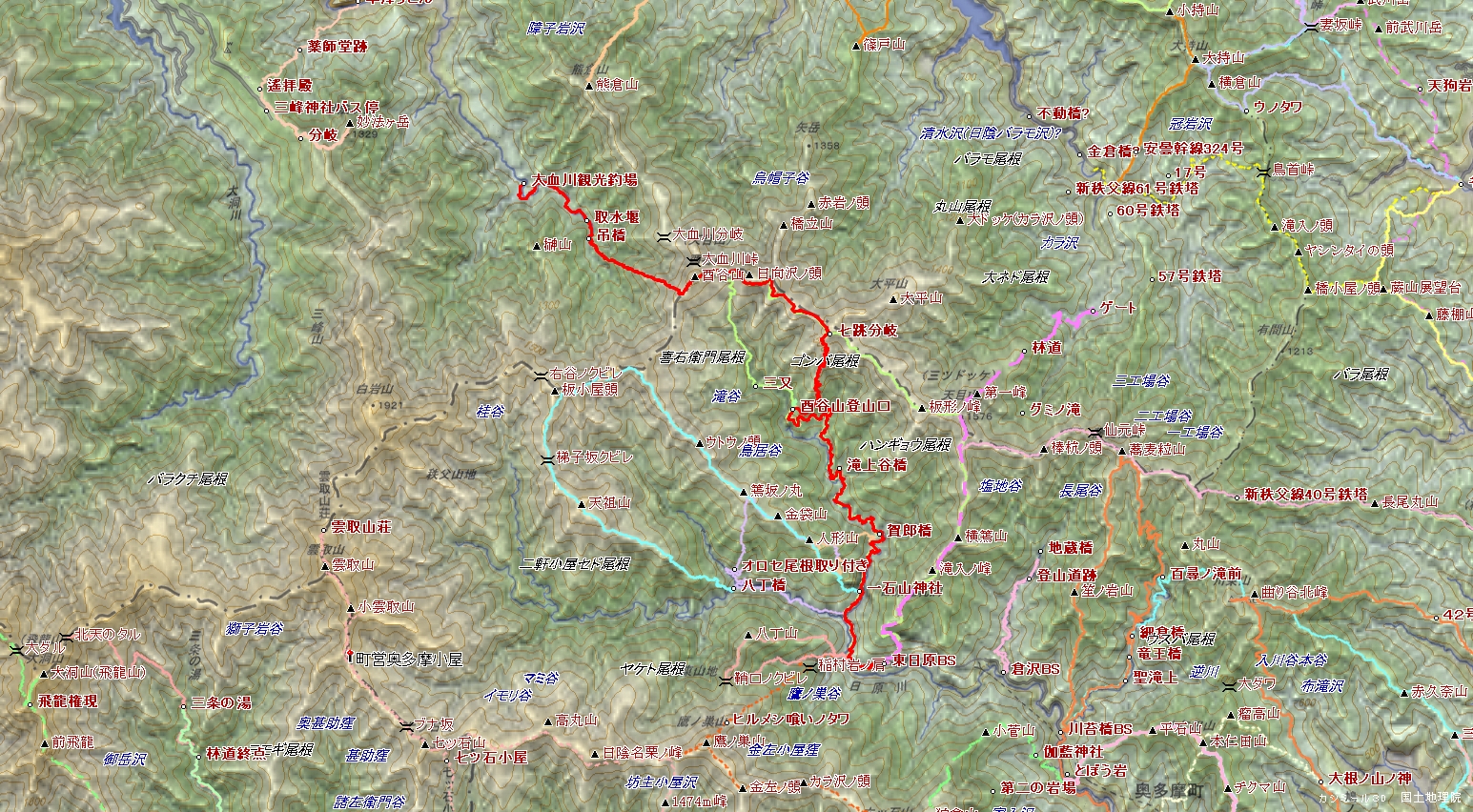 大血川観光釣場~酉谷山~七跳分岐~酉谷山登山口~滝上谷橋~東日原BS