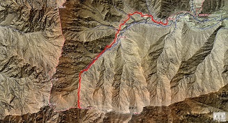 沢を高巻いて秋道を進む。雪渓は大きく崩れ、トンネル内を轟音を立てて水が流れていく。そんな様子を見ながらの秋道歩きは、侮れない。雪と土砂が混じっているところは滑りやすい。雪渓の幅が狭くなった「のど」と呼ばれる地点であろうか、今度は右岸へと渡渉する。